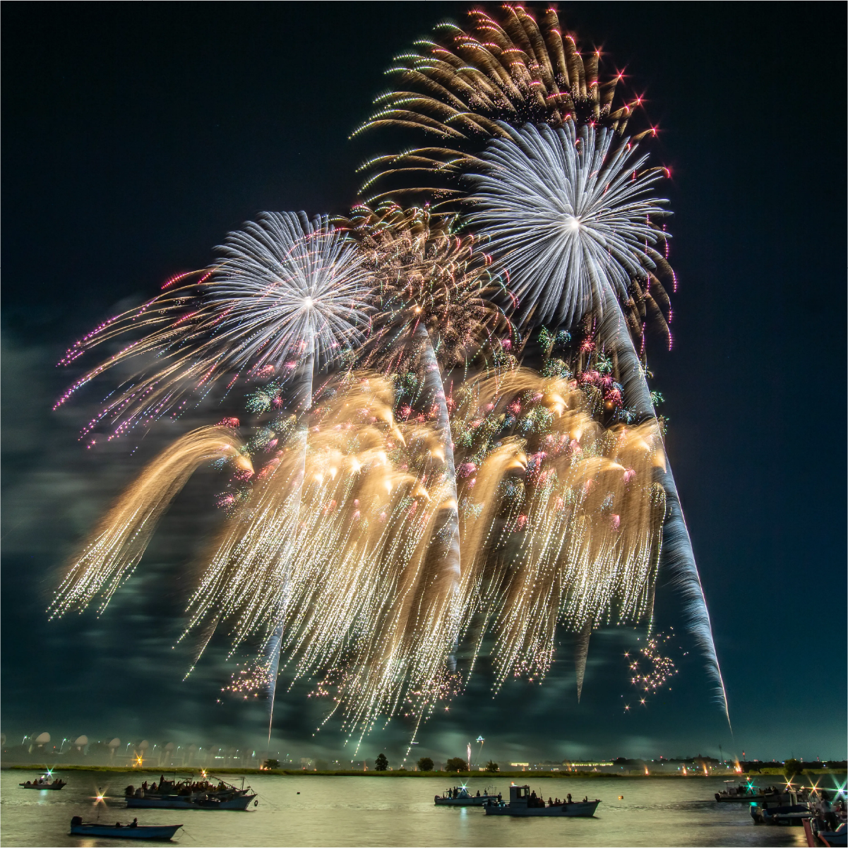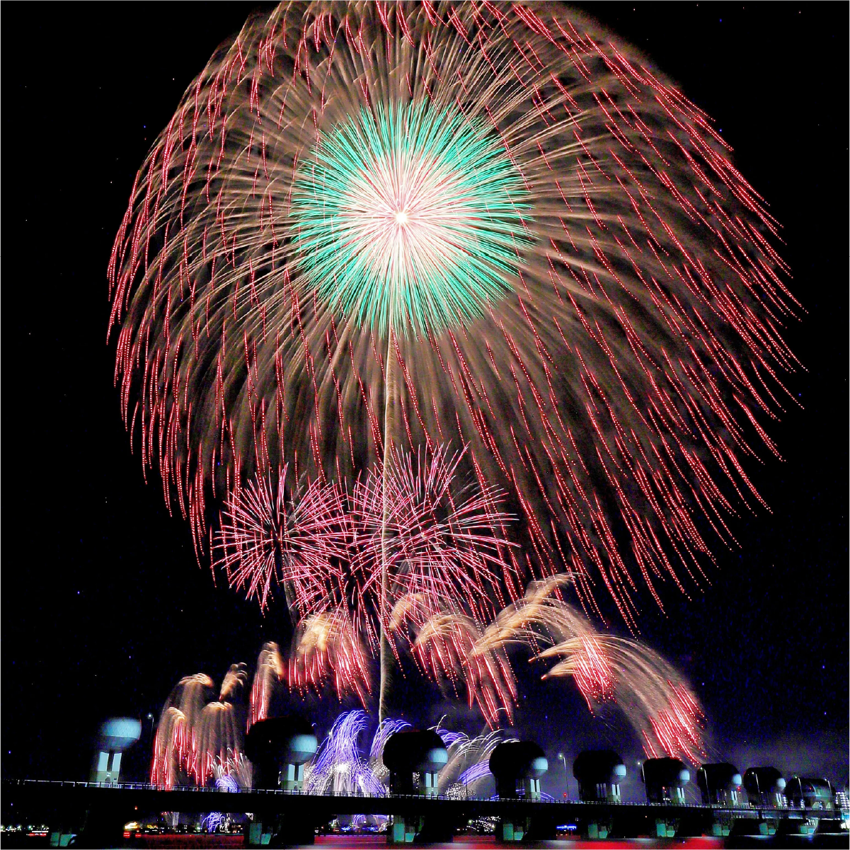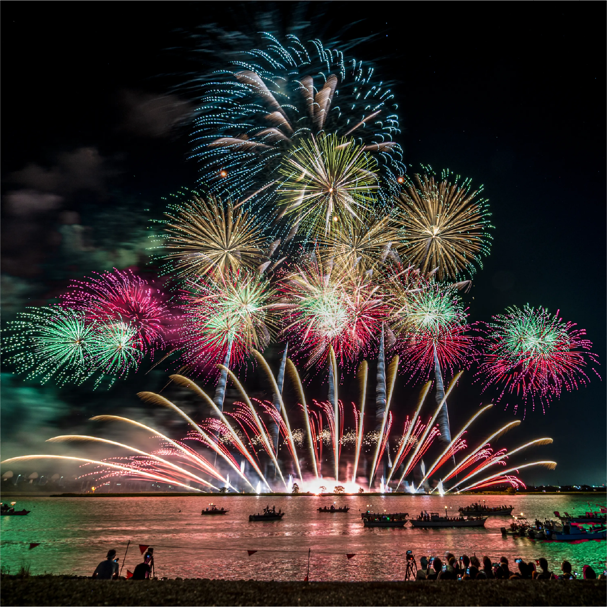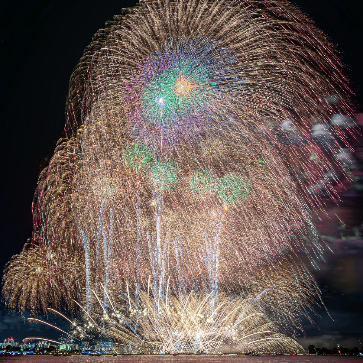 ミュージックワイドスターマインなど、音楽とシンクロした花火を存分に楽しめます。プログラムの後半には、美しさと迫力を兼ね備えた二尺玉が打ち上げられます。